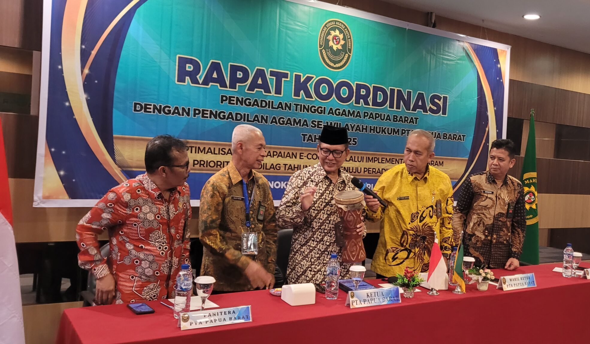 Pada kesempatan ini KPTA Papua Barat Dr. Ahmad Fathoni, S.H., M.Hum. berkasempatan meresmikan kegiatan. Didampingi sejumlah Pejabat PTA Papua Barat antara lain WKPTA Dr. Drs.H. Abdul Ghofur, S.H., M.H., Panitera Drs. Fakhrurazi, M.H., serta Sekretaris Nurmansyah, S.Ag., M.H, peresmian ditandai dengan pemukulan Tifa serta diikuti riuh tepuk tangan seluruh peserta yang hadir.